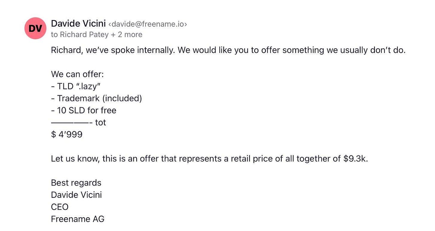 Freename has a trademark page on their site where you can contact them to register your TLDs. I emailed saying I’m the owner of the .lazy/ TLD on Handshake and that I was interested in registering the trademark. They replied with this: