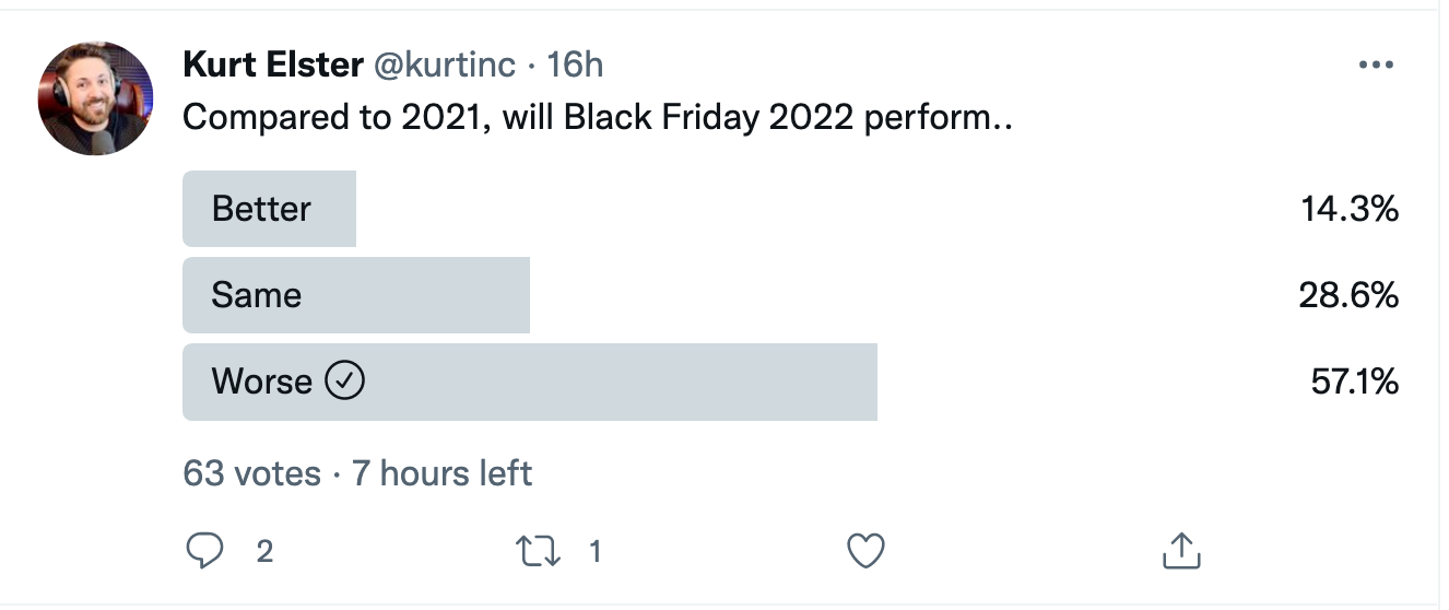 If you’re looking at ecommerce deals, you may want to factor in that this year, the majority of ecommerce sellers (in Kurt Elster’s sizable audience) think Black Friday is going to be worse than last year: