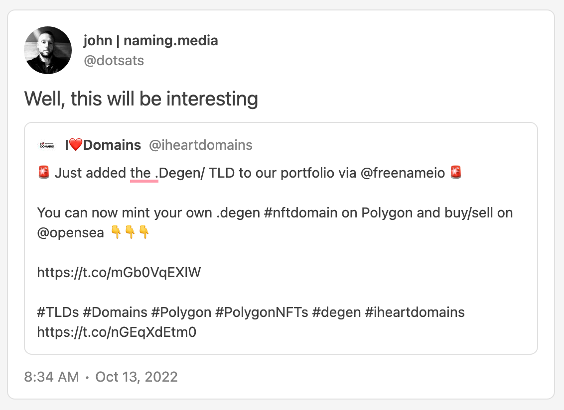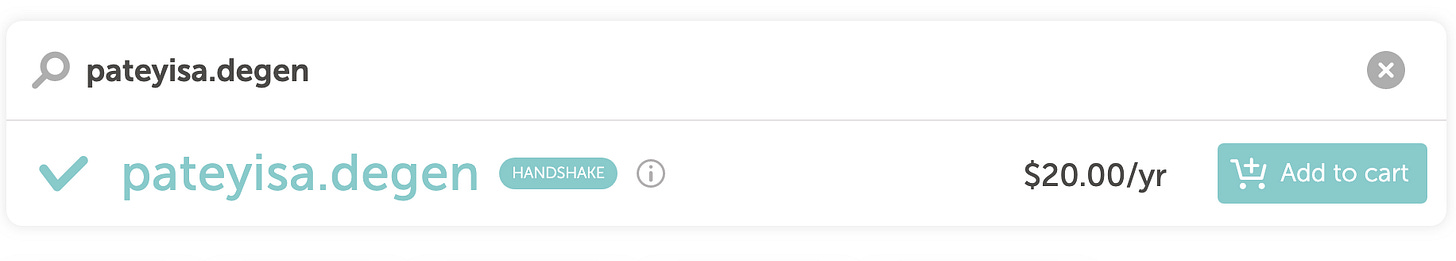 John is the owner of the Handhake TLD .degen which he sells on Namecheap, for example I could register: