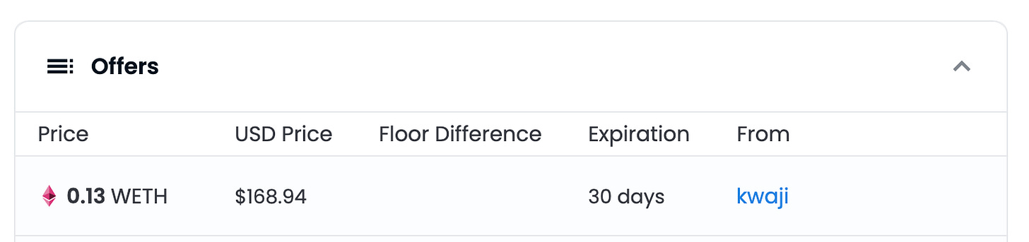 But what I find hilarious is that right now the best offer on the house / NFT is 0.13ETH or $168: